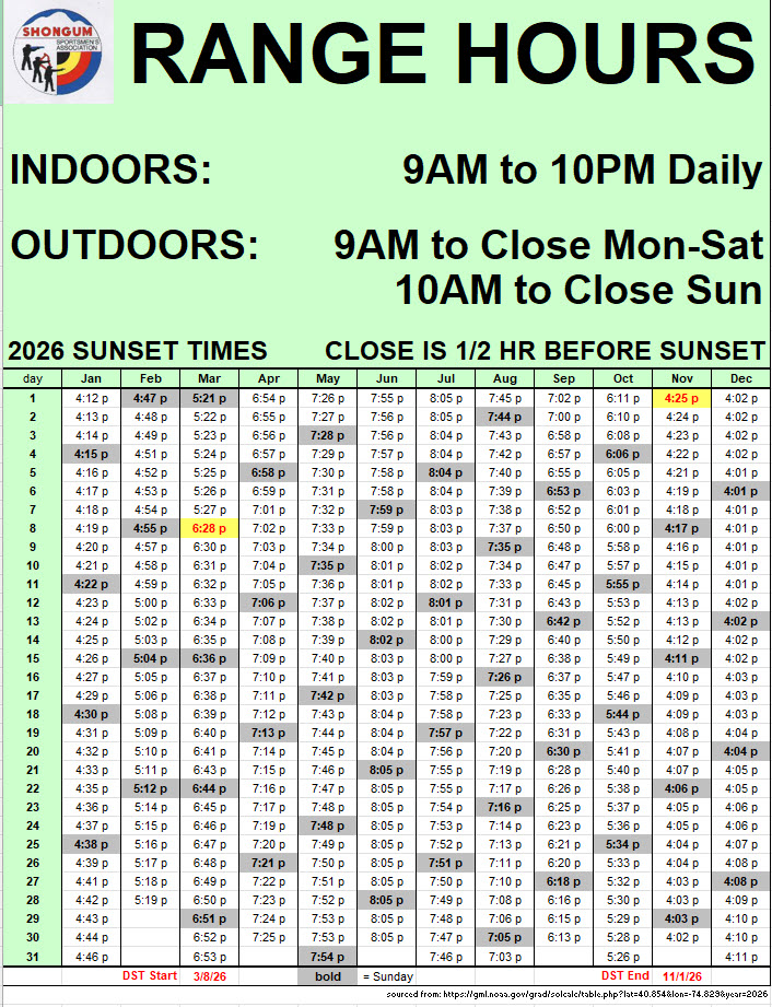 PLEASE OBSERVE THE OUTDOOR RANGE CLOSING TIMES LISTED ON THE BULLITIN BOARD BY THE CLUBHOUSE FRONT DOOR AND ALL POSTED SIGNS!